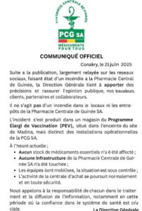 La Direction Générale de la Pharmacie Centrale de Guinée (PCG SA) a, par la suite, précisé qu’aucun stock de médicaments essentiels n’a été affecté et qu’aucune infrastructure n’a été endommagée.
