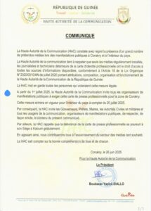 En conséquence, à compter du 1er juillet, la HAC exhorte tous les organisateurs d’événements dans la zone spéciale de Conakry à exiger systématiquement la présentation de la carte de presse professionnelle délivrée par les autorités compétentes. Lire le communiqué ci-dessous :