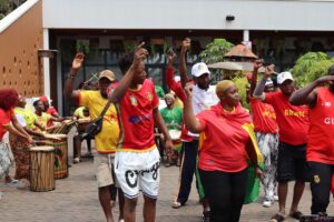 Dans un complexe hôtelier situé en périphérie de Kampala, les sons des tambours, balafons et autres instruments traditionnels résonnent avec vigueur. Pendant près de deux heures, les membres du CNSG enchaînent les répétitions, mêlant chants patriotiques et danses typiquement guinéennes. L’objectif est clair : insuffler une énergie positive à l’équipe nationale et faire vibrer les gradins du stade.