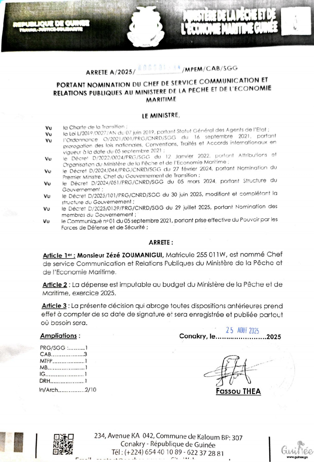 Ça y est. Dans un arrêté rendu public le 25 août dernier, le nouveau ministre de la Pêche et de l’Economie Maritime, Fassou THEA, a nommé M. Zézé Zoumanigui, au poste de chef de service communication et relations publiques dudit ministère.