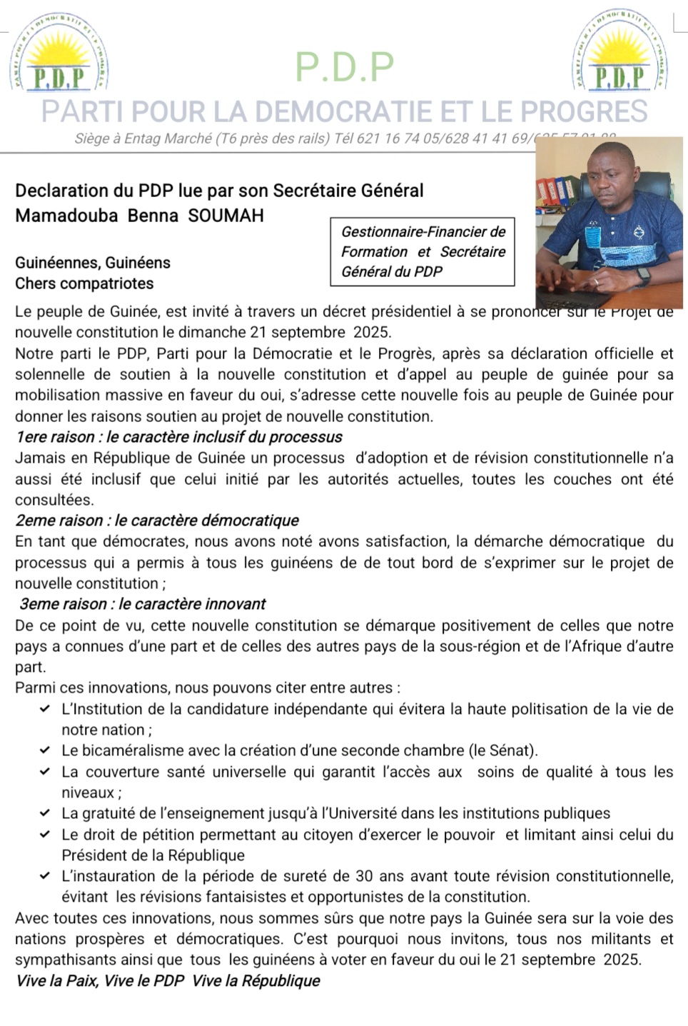 Référendum du 21 Septembre Campagne référendaire : voici la déclaration du Parti pour la Démocratie et le Progrès Ibrahima BAH Sep 12, 2025 0