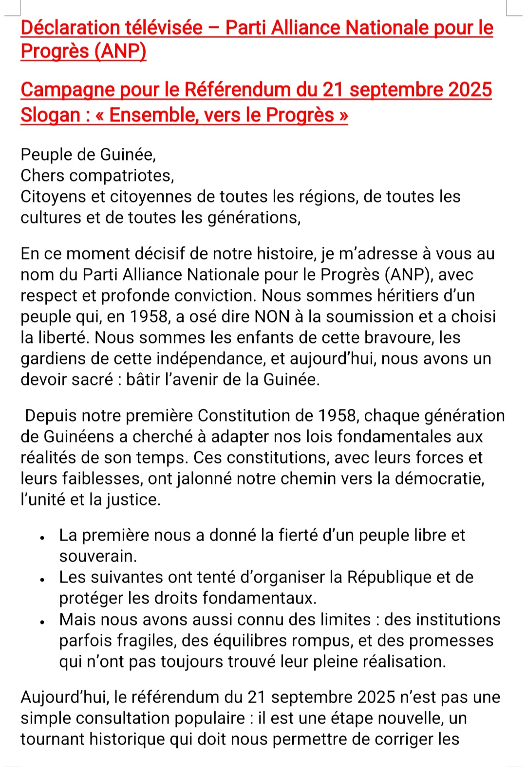 Ça y est. L’Alliance Nationale pour le Progrès (ANP) dirigée par son leader charismatique, Ansoumane Damara Camara vient de donner sa consigne de vote à ses militants et sympathisants pour le scrutin référendaire du 21 septembre prochain.