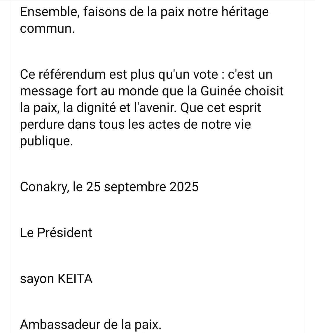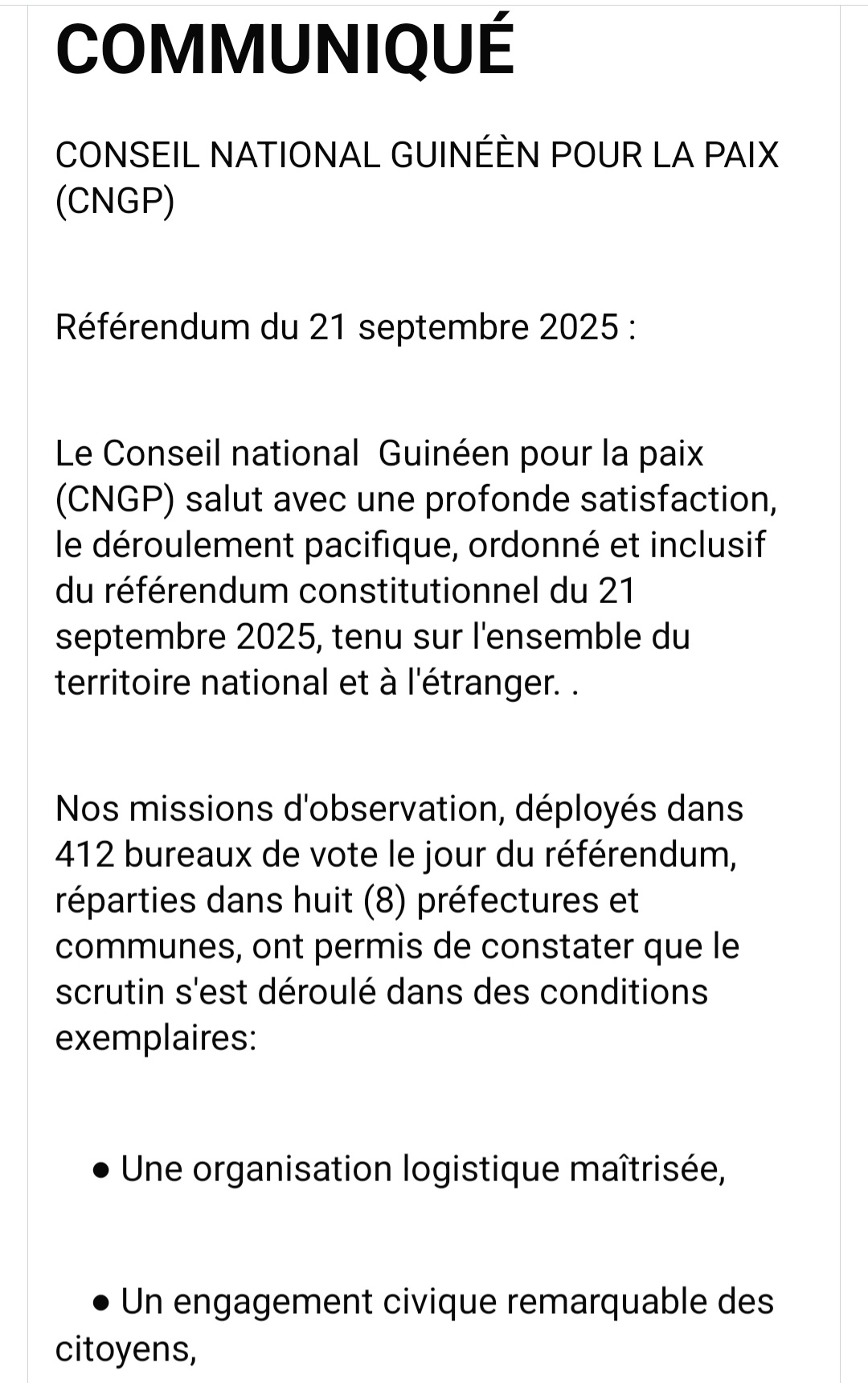 Ayant déployé de nombreux observateurs sur le terrain lors du scrutin référendaire du 21 septembre 2025, le Conseil National Guinéen pour la Paix (CNGP) que préside M. Sayon Keita, a rendu public son communiqué dont voici le contenu.