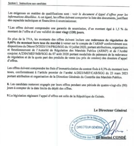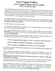 Dans le cadre de la mise en œuvre de son programme d’investissement pour l’exercice budgétaire en cours, la Société Nationale des Pétroles (SONAP) S.A lance un appel d’offres ouvert (AOO N° 001/SONAP/2025) pour la réalisation des travaux de construction d’un bâtiment R+3 destiné à l’extension de son siège situé à Minière-Commandayah, dans la commune de Dixinn à Conakry. Ce projet, d’une durée d’exécution de deux (2) ans, s’inscrit dans la volonté de la SONAP de renforcer ses capacités opérationnelles et d’améliorer ses infrastructures administratives. Les entreprises éligibles et qualifiées sont invitées à soumettre leurs offres conformément aux dispositions du Code des marchés publics de la République de Guinée. Lire l’intégralité de l’appel d’offre ci-dessous :