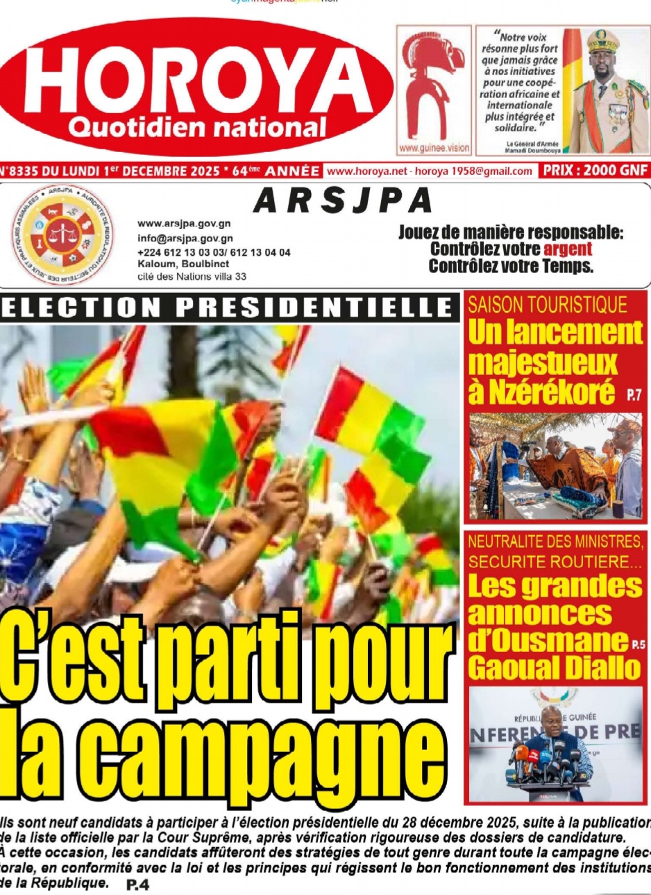 Actualités Voici le 8335 du lundi 1er décembre 2025 du Quotidien National Horoya Ibrahima BAH Déc 1, 2025 0 HOROYA DU 01 DECEMBRE 2025++