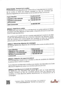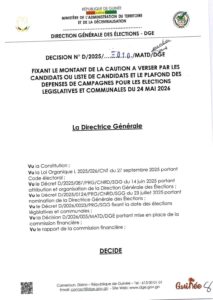 La Direction générale des élections (DGE) a rendu public, par arrêté en date du 9 mars 2026, les montants des cautions exigées pour les prochaines élections législatives et communales prévues le 24 mai 2026.
