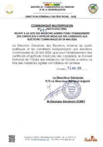 Selon ce document, le Conseil national de l’Ordre des médecins de Guinée a procédé à la sélection des praticiens autorisés à établir ces certificats, indispensables au dépôt des dossiers de candidature. La DGE invite ainsi les partis politiques et les candidats indépendants à se rapprocher des médecins agréés pour se conformer aux exigences légales du processus électoral.