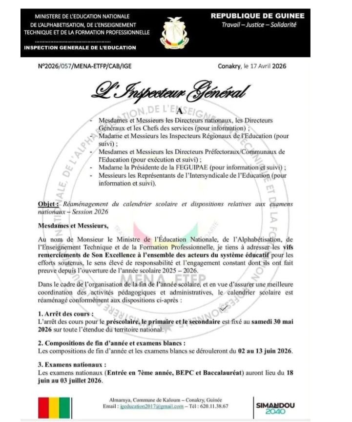 Le Ministère de l’Education Nationale, de l’Alphabétisation, de l’Enseignement Technique et de la Formation Professionnelle a procédé à un réaménagement du calendrier scolaire 2025-2026. Cette décision, portée par une note de l’Inspecteur général de l’éducation, vise à assurer une meilleure coordination des activités pédagogiques et administratives sur l’ensemble du territoire national.