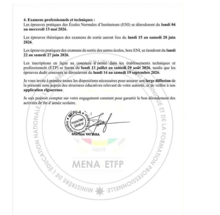 Par ailleurs, les inscriptions en ligne au concours d’entrée dans les établissements techniques et professionnels se feront du 13 juillet au 29 août 2026, tandis que les épreuves dudit concours se dérouleront du 14 au 19 septembre 2026.